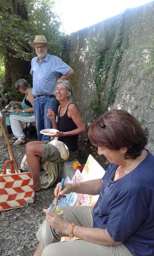 Le premier stage s'est déroulé à Varages dans le jardin de Claire, au bord de la rivière et du canal qui a tempéré la chaleur et permis de tremper le pinceau en direct...:) L'eau est reine dans l'esprit du stage car c'est elle qui dirige le driping sur la toile, sans eau, l'alchimie particulière de cette technique resterait inerte. Eau, mouvement, pigments, une trilogie parfaitement équilibrée et nécessaire pour poser les bases d'un travail au résultat surprenant et parfois magique.